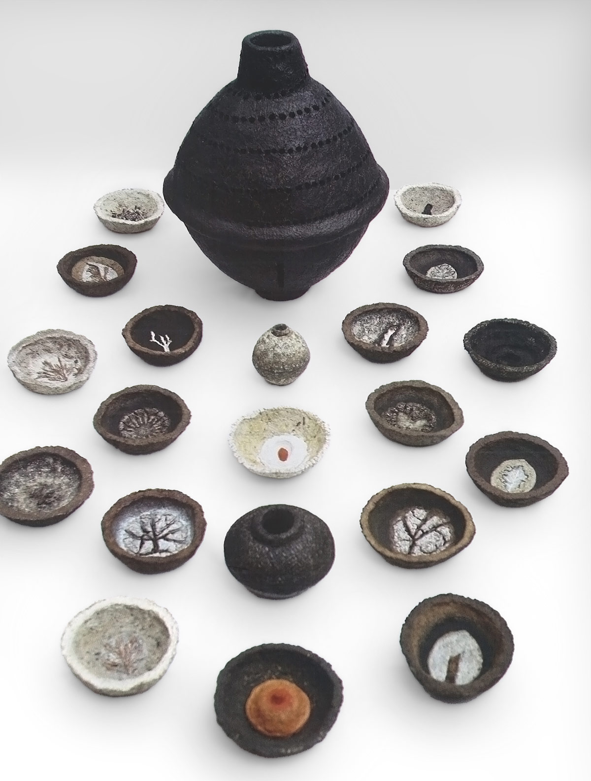 Tecnica: CARTAPESTA, ARGILLA, BITUME, PIGMENTO NERO FUMO, LITIPONE, CENERE, CARBONE, RAMI, FOGLIE, COLLA, VERNICE
